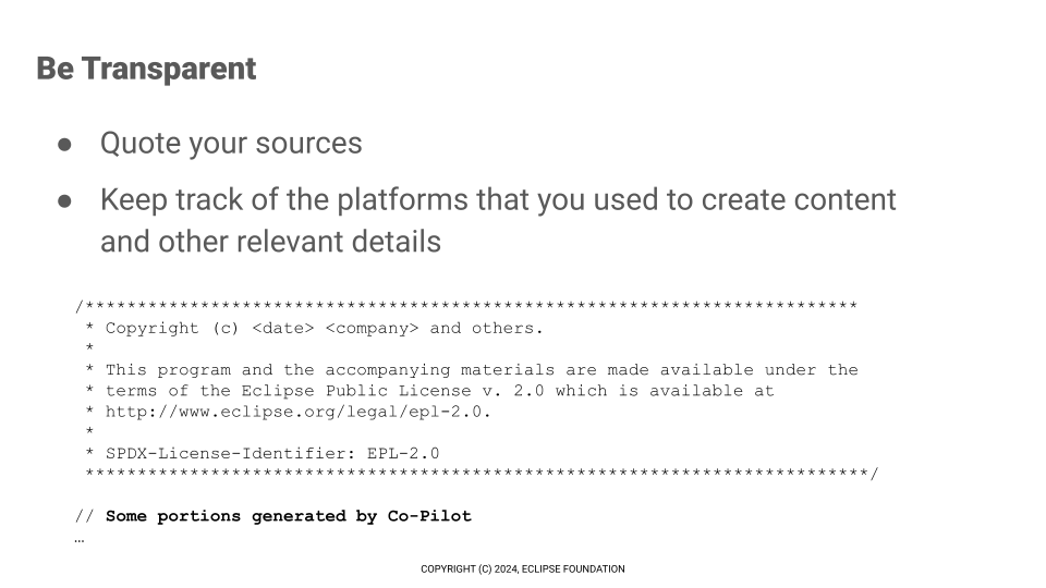 In this session, we presented the Eclipse Foundation's Generative Artificial Intelligence Usage Guidelines for Eclipse Committers. There is some discussion about copyright in the context of GPT technologies, but the primary focus is the guidelines themselves. Bear in mind that Wayne is not a lawyer, and nothing that we present in this session should be considered legal advice.