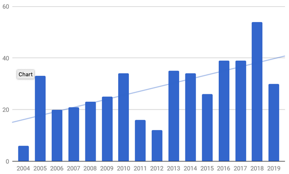 The number of proposals for new Eclipse open source projects that we receive year-after-year went down a bit in 2019, but is generally on an upward trend. Note that the spike in 2018 includes a large number of projects that are part of the Jakarta EE effort.