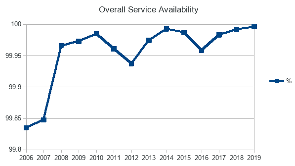 Core service availability (Git/Gerrit, www.eclipse.org, and Bugzilla) for calendar year 2019 was 99.996%, up from 99.992% in calendar year 2018. 2019 was our best year yet for service stability and availability.
