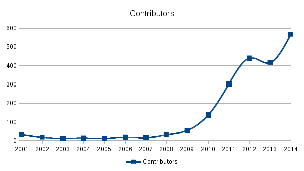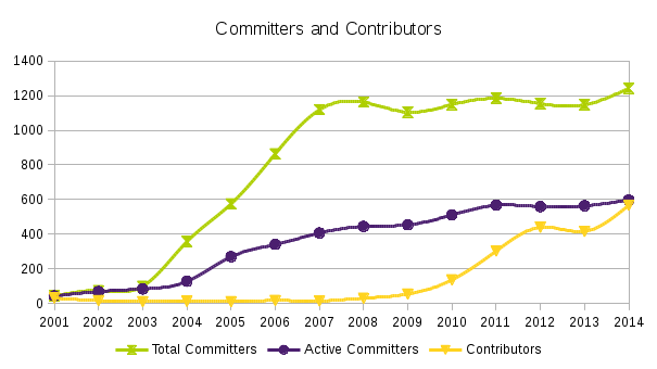 Over the past several years, the Eclipse Foundation has beenfocusing on reducing barriers to contribution to Eclipse projects.The trend lines clearly show that this effort is bearing fruit, withan increase of almost 200 contributors in 2014.