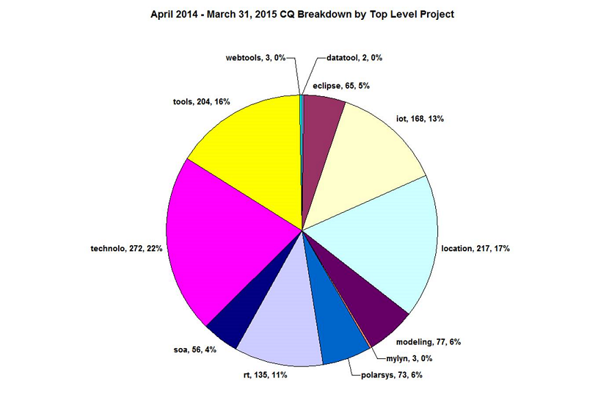During the time period spanning April 1, 2014 to March 31, 2015,the Eclipse Foundation received 1,275 requests for code review andcompleted 1,302 reviews.[1] As more Projects come on board, the needfor code review continues to grow, particularly for the EclipseFoundation’s working groups. In January 2015, the backlog ofrequirements reached an all time high of 307, slightly edging out theprevious high of 306 reached in 2012. The result has been anincreased delay in completing IP reviews for some projects. In aneffort to address this issue, an additional IP analyst will be hiredin 2015.